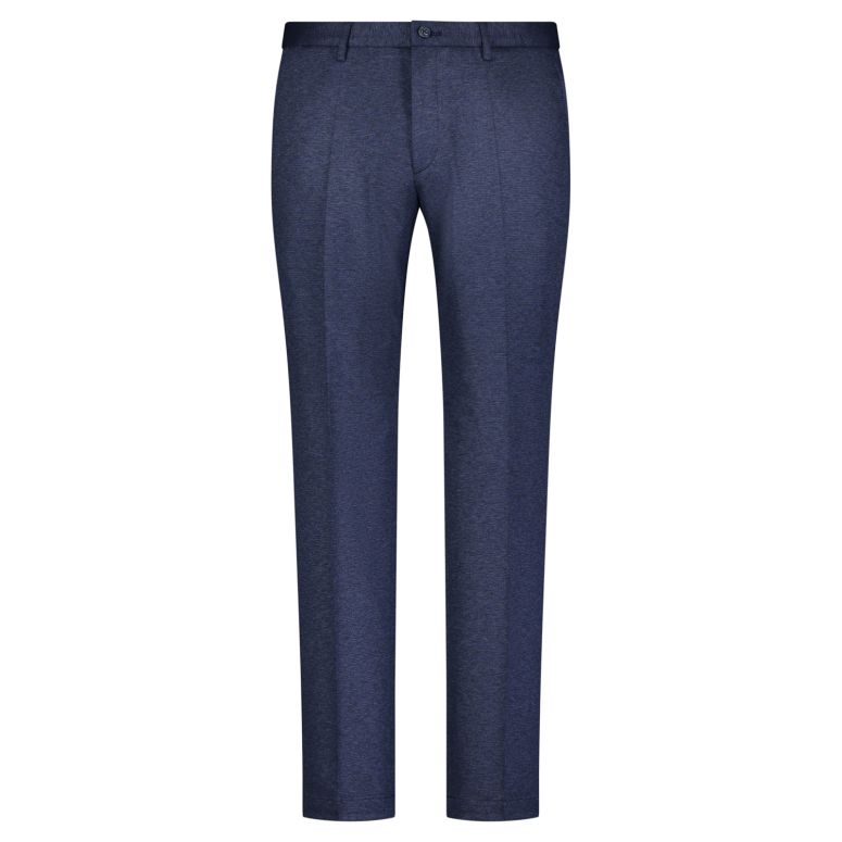 Diese fein melierte Jersey-Hose in Hellblau verbindet italienische Materialqualität mit deutscher Schneiderkunst. Die subtile Melierung verleiht dem Stoff eine angenehme Tiefenwirkung, die sich sowohl zu Businesshemden als auch zu Leinen-Shirts kombinieren lässt.